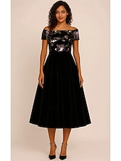 More information about A-Line Floral Sequin Lace Cocktail Dresses Stretch Velvet Elegant Formal Dress Formal Wedding Tea Length Sleeveless Off Shoulder Sequined with Appliques 2025