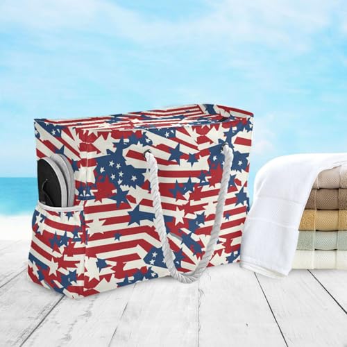 JUNZAN Usa Flags Beach Tote Bag with Handles Swim Pool Bag Beach Totes Bags for Women with Waterproof Pockets Red and Blue 4
