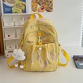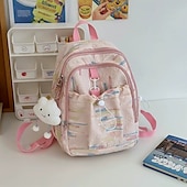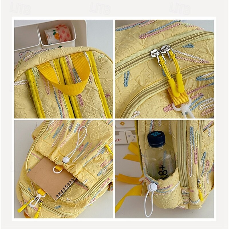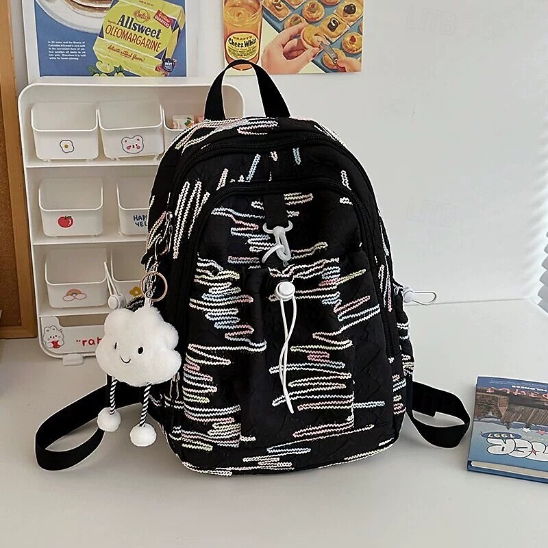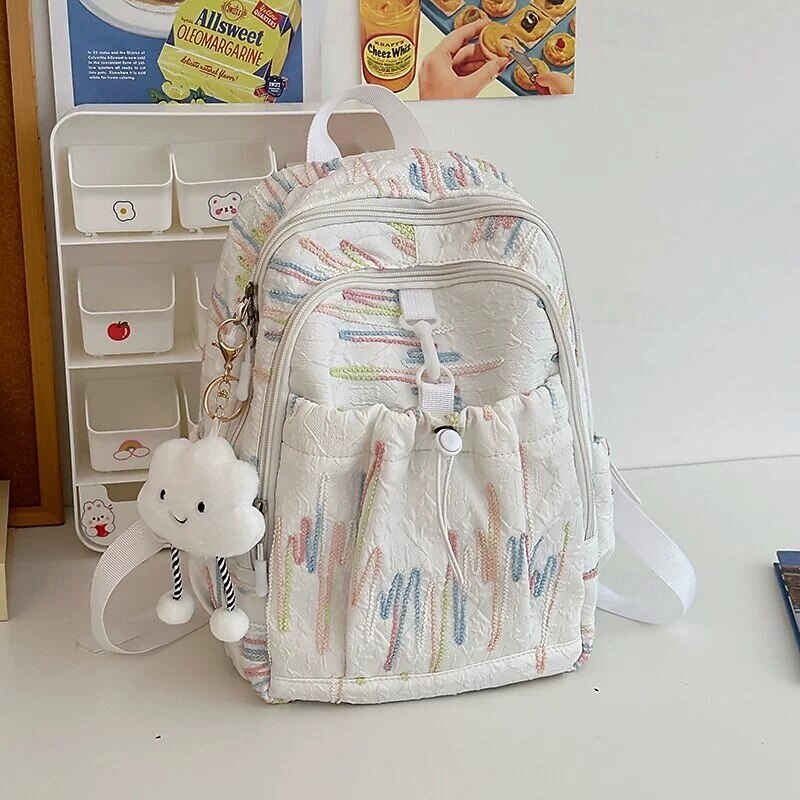 HOT ! Girls' Pastel Pink Quilted Backpack – Cute Lightweight School Bag with Cloud Keychain and Front Drawstring Pocket
