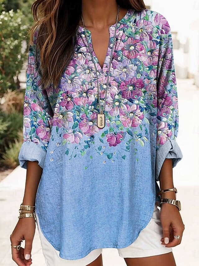 More information about Women's Blouse Tunic V Neck Long Sleeve Boho Casual Floral Graphic Elegant Stylish Regular Tops Daily Print Blue Purple Green