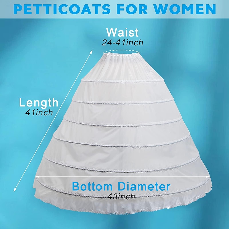 Highlights ❤ Keeping Dress Full --- 6 Hoop Skirt for Women is Single Layer with 6 Strong Adjustable Hoops, 4 Hoop Skirt 5 Ruffles Layers is Made with Strong Adjustable Hoops and Beautiful Ruffles layers, Which Help Make Your Beautiful Dress Full Dome Shape. ❤ Adjustable Waist --- 6 Hoop Skirt Measures 24-41 inch, 4 Hoop Skirt Measures 24-36 inch, Elastic Closure on Waist Make This Petticoat Suit for Most Women From Size 2 to Size 18W. ❤ Fit Occations --- Crinoline Hoop Skirt for Women Goes Perfect with Wedding Dresses, Ball Gown and Many Other Floor Length Formal Dresses. ❤ Washing Method --- Hoop Skirt for Women Can be Hand Wash Only, Don'T Use Machine Wash, Please Hang Dry, Avoid Long Time Exposure to Sunlight.