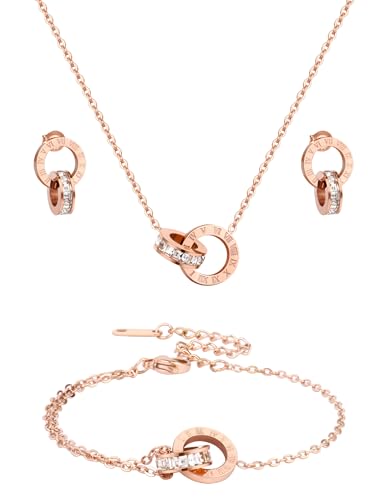 • Material: This interlocking circle necklace bracelet earrings set is made of rose gold plated stainless steel. Color not easily tarnish. It's hypoallergenic, lead and nickel free, no harm to your skin.