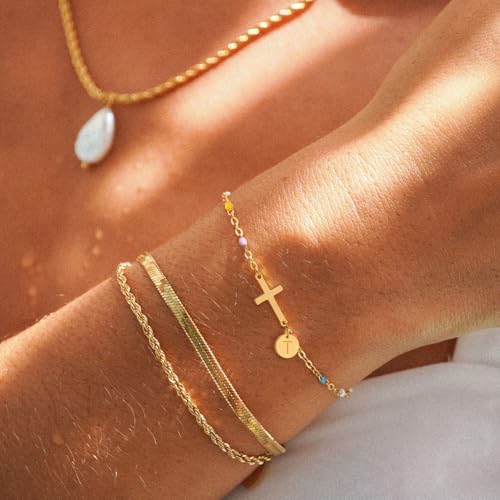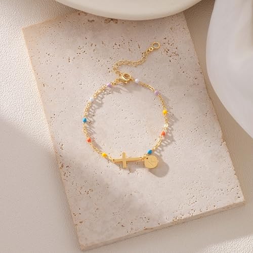 HOT ! Cross Bracelet for Women Dainty Colorful Beaded Initial Bracelets for Women Teen Trendy Gold Christian Religious Baptism Jewelry Gifts Easter Basket Stuffer