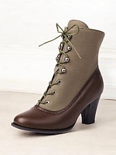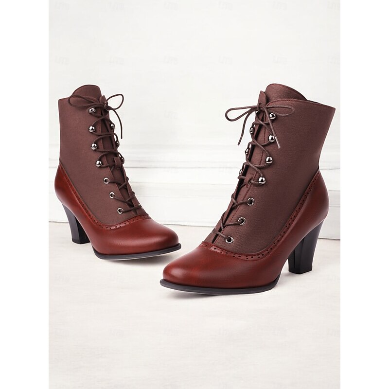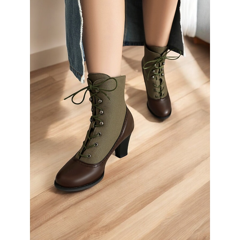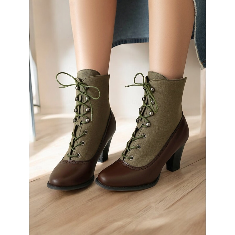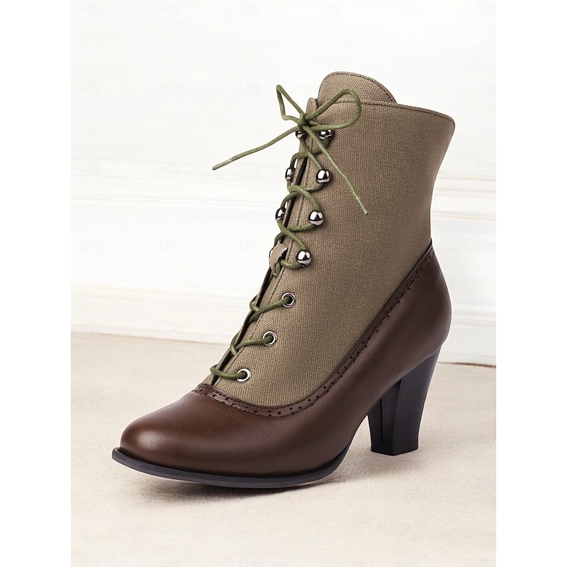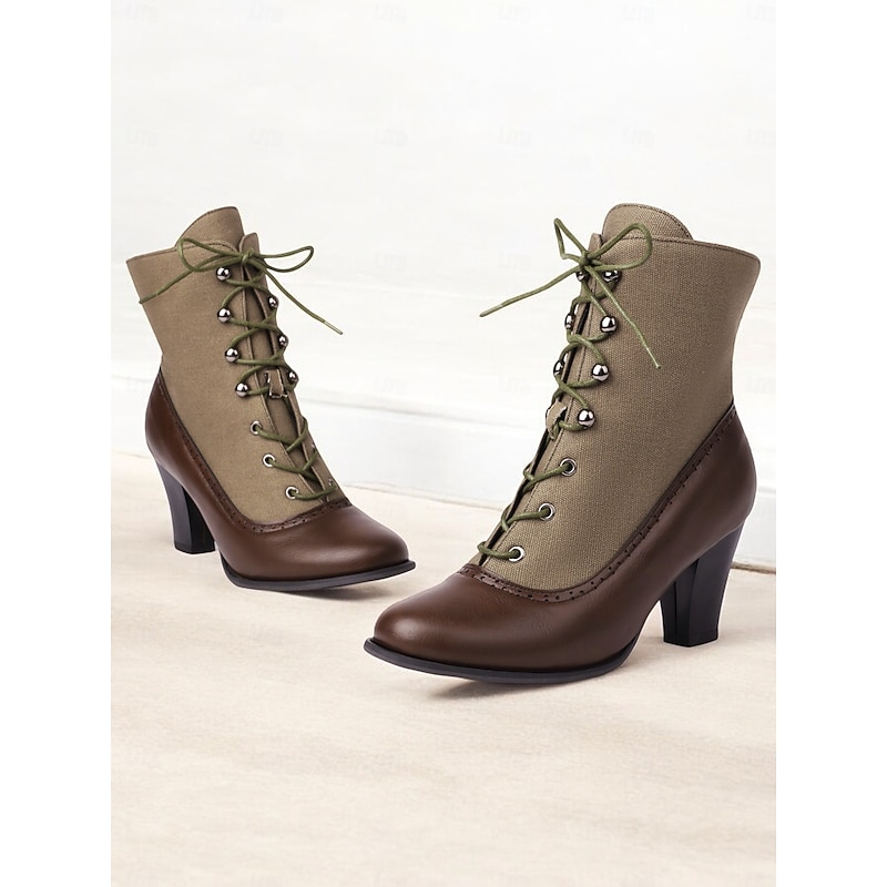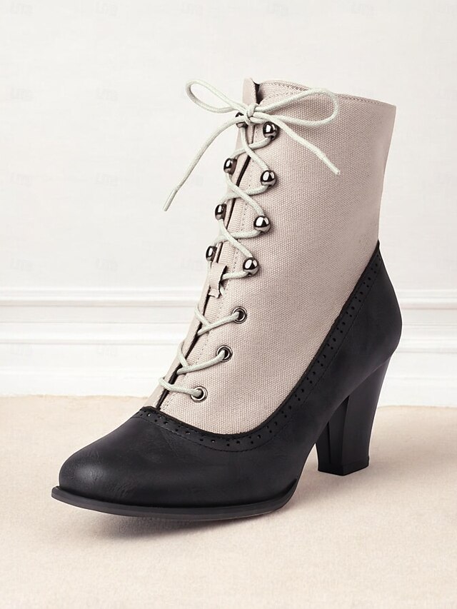 Highlights [Fabric and Style] Crafted with an elegant blend of PU and cloth, these Victorian Vintage Lace-Up Ankle Boots offer a retro style with a luxurious feel. The combination of high-quality faux leather for the lower portion and a soft, light beige canvas fabric for the upper ensures both durability and comfort. [Design Highlights] Featuring a lace-up front with metallic eyelets, these boots provide style and adjustability. Decorative rivets and perforations near the seams add sophistication, while the contrasting black faux leather toe cap enhances the overall design. The boots have a sturdy chunk heel, balancing comfort and style for any occasion. [Occasions] Perfect for daily wear, work settings, and events that require a touch of vintage elegance, these boots are versatile enough to complement a variety of outfits including jeans, skirts, and dresses. Whether for casual outings or semi-formal occasions, they effortlessly add charm to any wardrobe. [Size Range] Available in a range of sizes to accommodate various fits: US5.5 to US10.5. It is recommended to select your usual size for the best fit. [Design and Trends] With their round toe shape and color block pattern, these booties embrace the retro trend, making them a must-have fashion piece for the upcoming seasons.