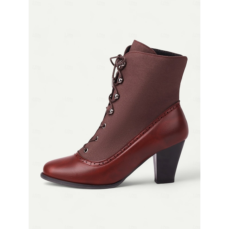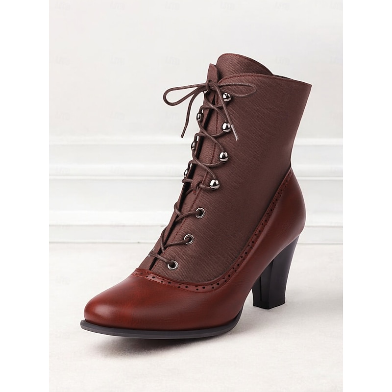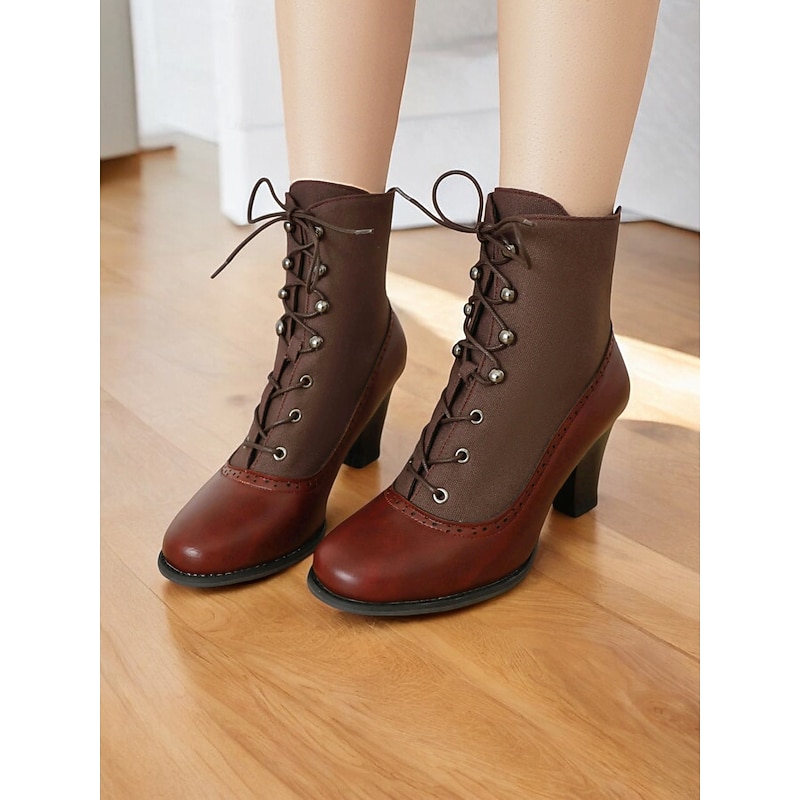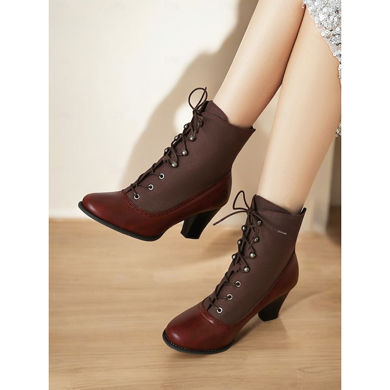 Victorian Vintage Lace-Up Ankle Boots with Heels for Women – Retro Style Faux Leather and Fabric High Heel Boots 1