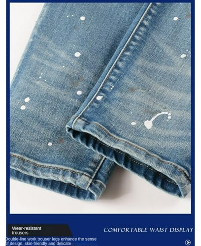 Jeans Pants Trousers Denim Men Stretch Slim Fit Street Trendy Piercing Worn Hole Hairy Retro Set Zircon Shining Casual Small Leg(Blue,29) 5