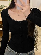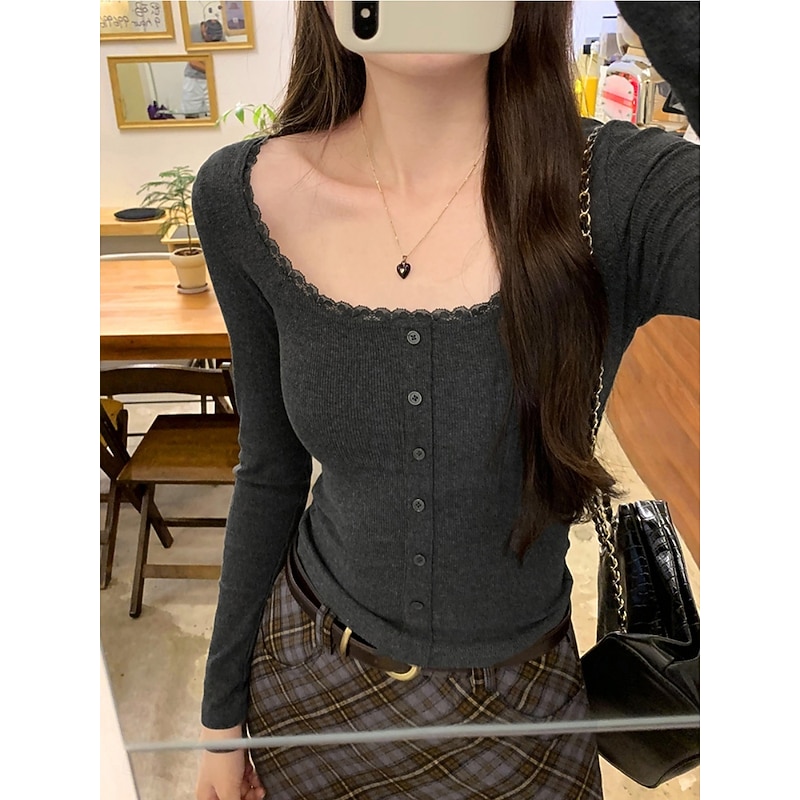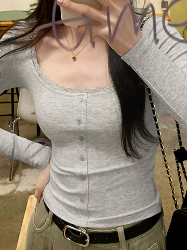 More information about Women's Blouse Solid Color Stylish Basic Casual Long Sleeve U Neck Regular Tops Daily Patchwork Buttons Black Dark Gray Gray Spring Fall Winter