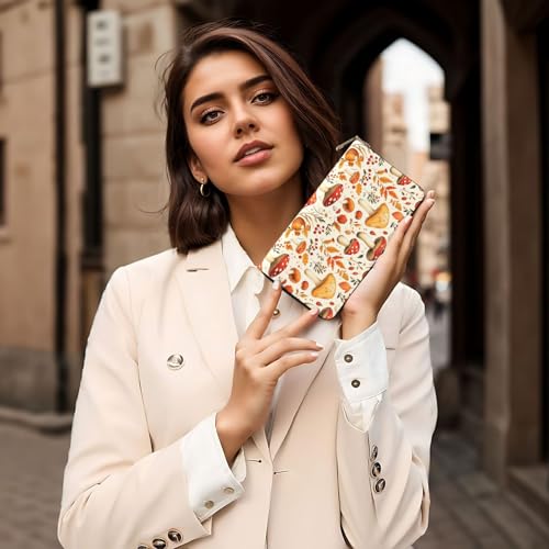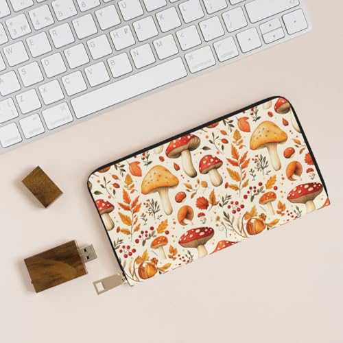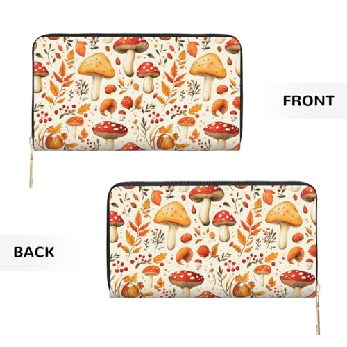 Leather Thin Slim Wallets for Women & Men - Mushroom Maple Leaves Print Card Wallet Holder with Zipper 7