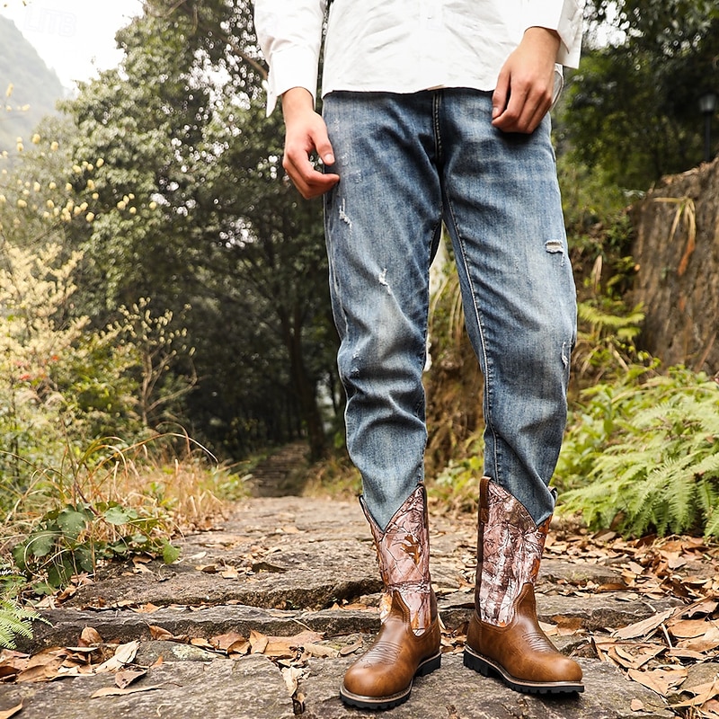 Men's Boots Cowboy Boots Embroidery Retro Handmade Shoes Walking Sporty Casual Outdoor PU Leather Comfortable Slip Resistant Mid-Calf Boots Loafer Yellow-Brown Brown Summer Fall Winter 12