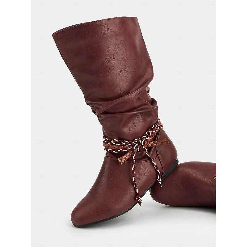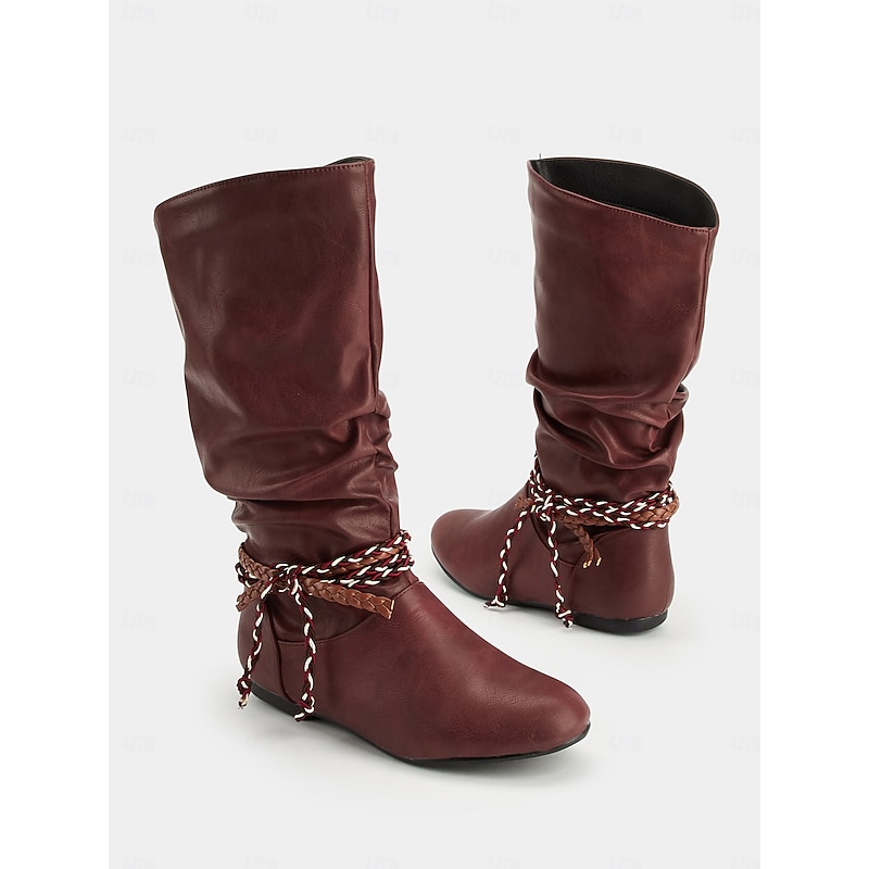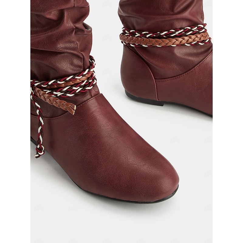 HOT ! Women's Burgundy Faux Leather Mid Calf Boots – Slouchy Flat Riding Boots with Braided Straps for Fall Outings, Travel and Outdoor Festivals