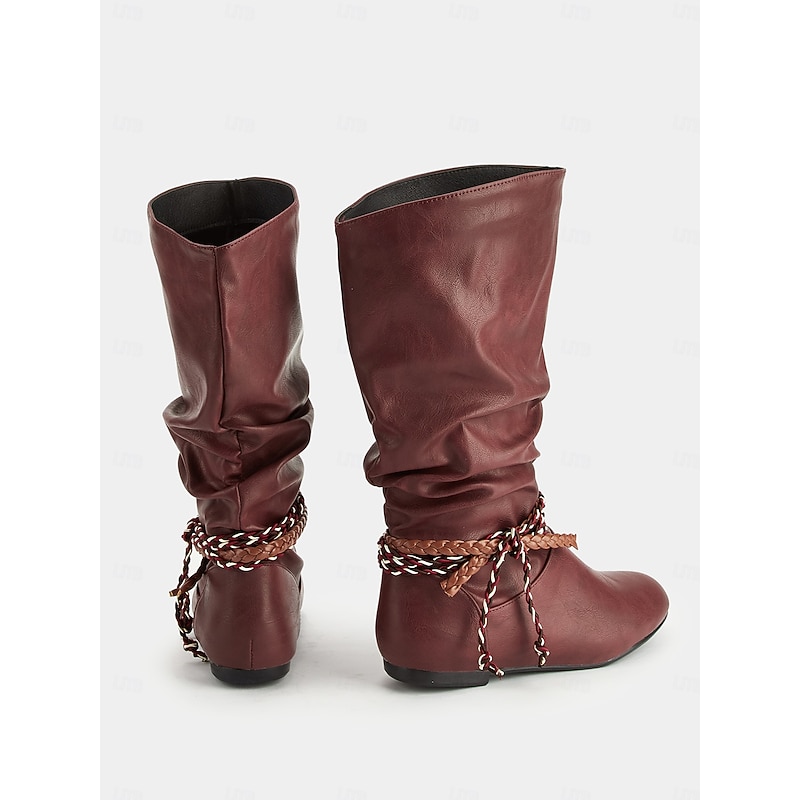 Women's Burgundy Faux Leather Mid Calf Boots – Slouchy Flat Riding Boots with Braided Straps for Fall Outings, Travel and Outdoor Festivals 5
