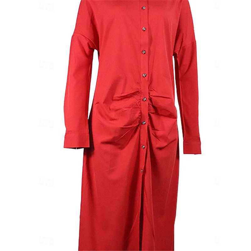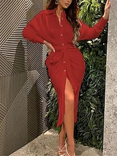 Highlights [Fabric] This sophisticated dress is crafted from high-quality polyester, offering a lightweight and breathable fabric that ensures both comfort and durability. Its micro-elasticity provides a comfortable fit, making it easy to wear for extended periods. [Style] Featuring a slim, bodycon fit, this dress elegantly accentuates the body's natural curves. The maxi-length design adds a sense of grace, while the shirt dress style maintains a formal yet sexy appeal. [Design Highlights] The dress boasts a classic shirt collar and a button-down front, combined with a chic twist-knot detail at the waist that creates a flattering silhouette. Long sleeves offer additional coverage, and the side slit adds a modern and stylish touch to the overall aesthetic. [Occasions] Suitable for cocktail parties, formal gatherings, or any special event during spring or summer. Its versatile style allows you to transition seamlessly from a casual day out to a more formal evening setting. [Size] Available in a range of sizes from S to XL, catering to a variety of body types. The crisp white color, along with options in black and red, offers timeless elegance that complements any wardrobe.