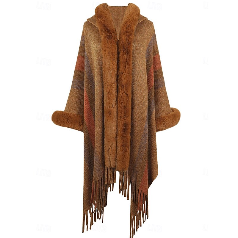 : The luxurious faux fur trim along the collar and cuffs adds a touch of elegance, while the fringed edges give it a bohemian flair. Featuring an open front for a stylish and laid-back appearance, this cloak effortlessly marries sophistication with casual charm.