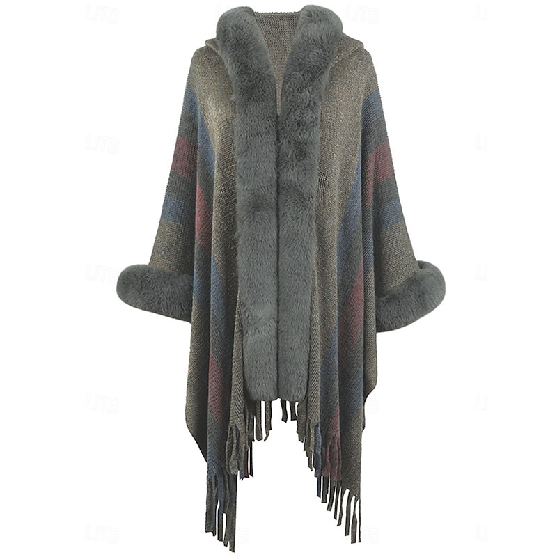 Women's Cloak / Capes Outdoor Street Daily Wear Fall Winter Regular Coat Regular Fit Thermal Warm Breathable Stylish Casual Jacket Long Sleeve Stripe Faux Fur Trim Khaki Apricot Gray