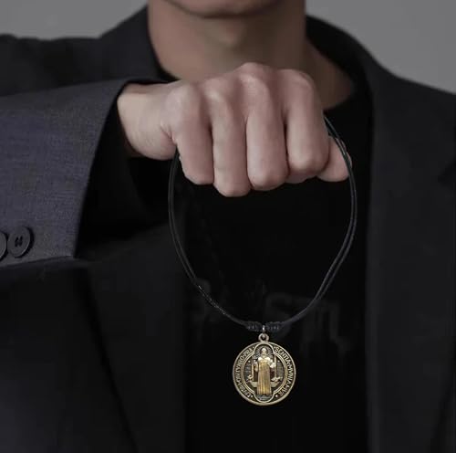 • Meaningful Saint Benedict Medal Design. Vintage-style Saint Benedict coin pendant made of antique bronze, featuring sacred Christian symbolism and Latin inscriptions for spiritual protection.