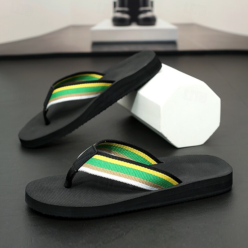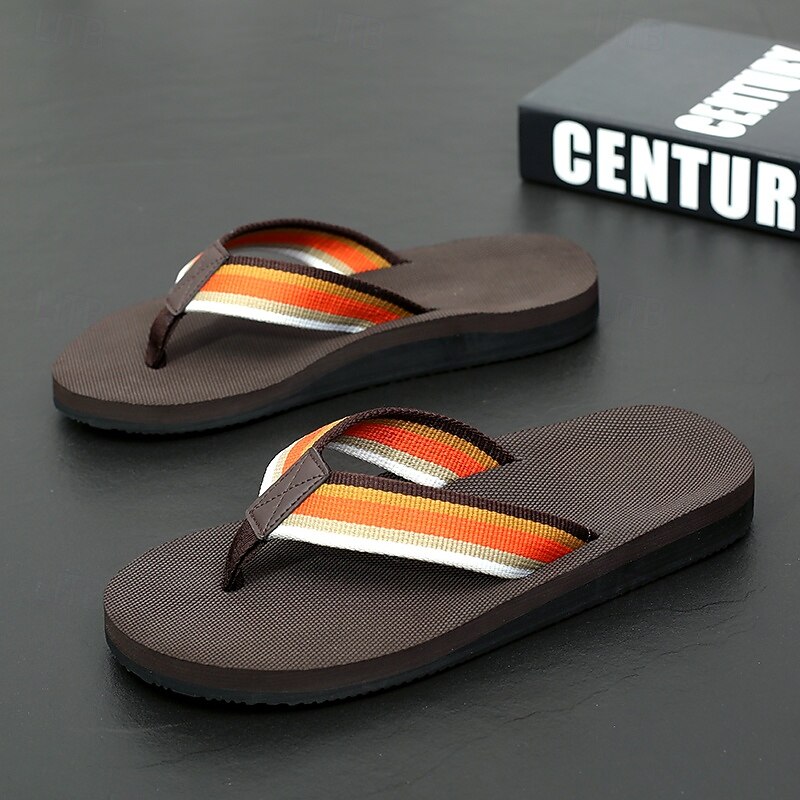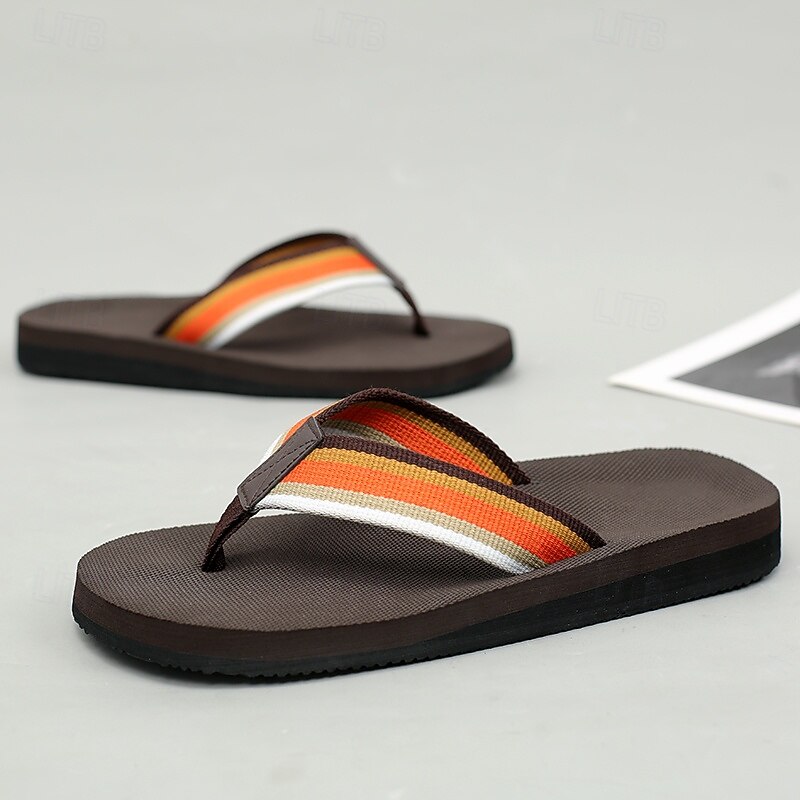 HOT ! Men's Brown Flip Flops with Multi-Color Striped Strap, Casual Style for Beach and Summer Wear