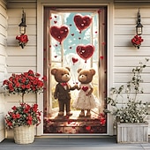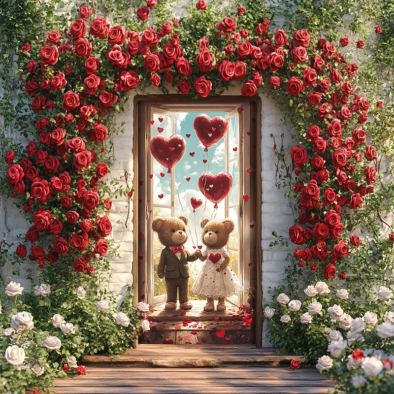 Highlights [Fabric] : Made from high-quality polyester, this door mural offers durability and a smooth finish, ensuring it holds up well both indoors and outdoors. The material is lightweight yet strong, allowing for easy installation and removal. [Design] : Featuring a classic design, this door cover showcases two adorable teddy bears crafted with intricate attention to detail. The bears complement the romantic setting with one holding a vibrant bouquet of roses and the other embracing a heart-shaped cushion. Heart-shaped balloons in the background and a cascade of red and white roses around the doorway add to its magical appeal. [Design Highlights] : The mural incorporates whimsical elements like gently floating balloons and beautifully detailed florals, enhancing the romantic and cozy vibe. The vibrant colors and intricate details make it a standout piece that transforms any entrance into a heartwarming display. [Occasions] : Perfect for Valentine's Day, anniversaries, romantic celebrations, or as everyday décor to add a touch of warmth and affection to your home. This versatile design makes it suitable for a variety of special occasions and settings. [Size] : Available in a universal size of 90 cm by 200 cm, this door cover fits most standard doors, providing a perfect fit and a seamless, elegant look for your space.