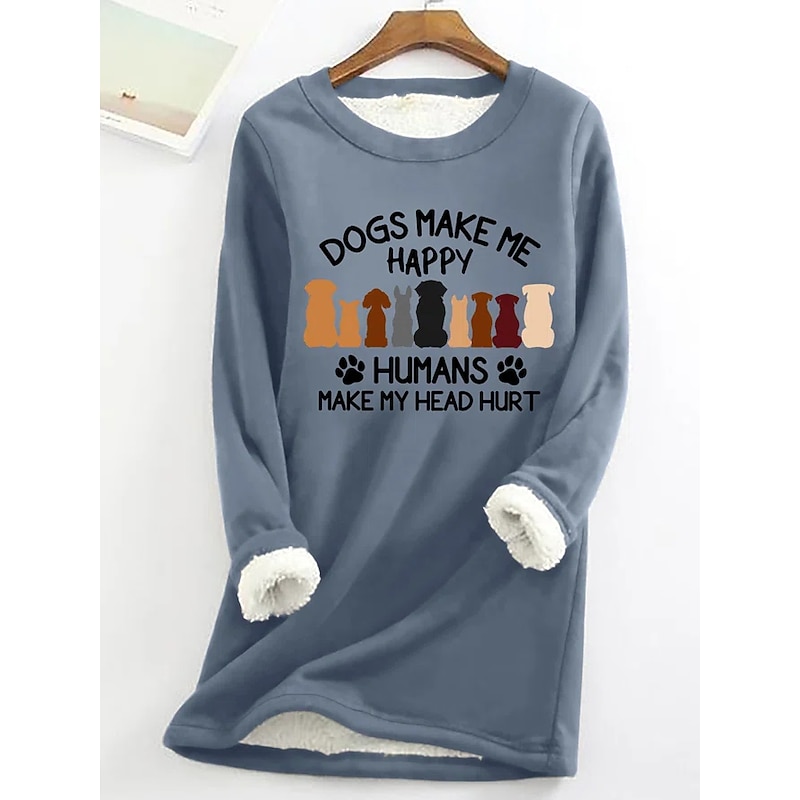 Highlights [Fabric] : This women's sweatshirt is crafted from a blend of polyester and fleece, accented with a cozy Sherpa lining for enhanced warmth and comfort. The plush fabric ensures a soft, fuzzy feel that's perfect for fall and winter seasons. [Fit] : Designed with a regular fit, this sweatshirt offers a relaxed and comfortable wear. The long sleeves and round neckline contribute to its casual style, making it a versatile choice for everyday activities. [Design Highlights] : The sweatshirt features a playful graphic design on the front, with bold lettering that reads "DOGS MAKE ME HAPPY, HUMANS MAKE MY HEAD HURT," alongside an array of charming dog silhouettes. This whimsical design is sure to resonate with dog lovers. [Occasions] : Ideal for casual outings and sports activities, this sweatshirt is a great choice for dog enthusiasts looking to showcase their passion in a stylish and cozy way. Whether for lounging at home or venturing outdoors, it offers both comfort and flair. [Sizes] : Available in a range of sizes from S to 2XL, this sweatshirt ensures a fit that suits a variety of body types, providing both style and comfort for all dog lovers.