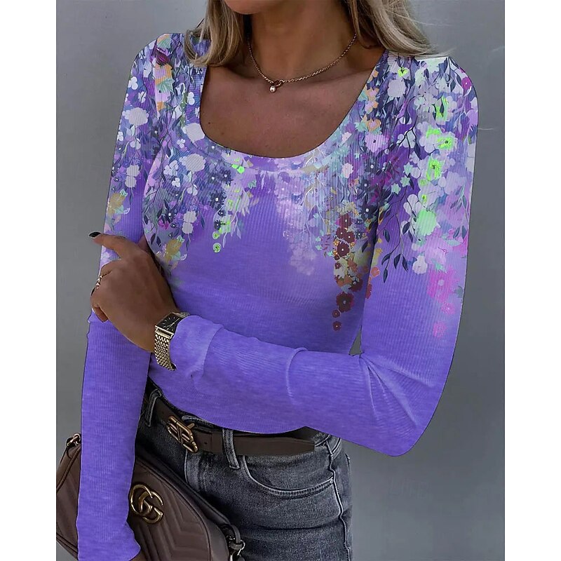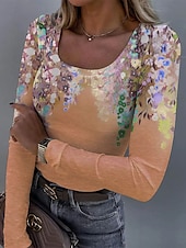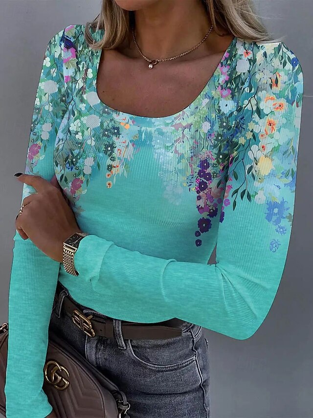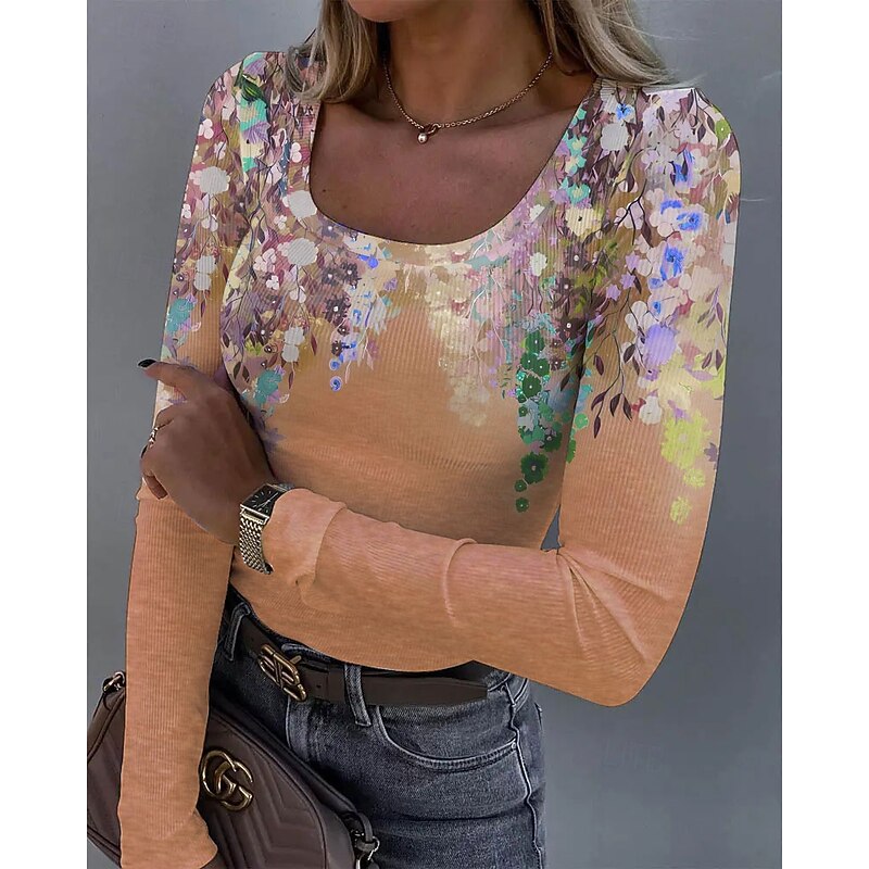 More information about Women's T shirt Long Sleeve Ribbed Graphic Square Neck Long Sleeve Casual Tunic Floral Plants Vintage Stylish Regular Tops Daily Print Pink Blue Purple Orange Green Spring Fall Prefall