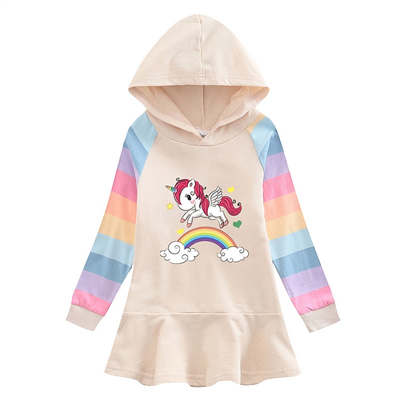 Kids Girls' Dress Rainbow Unicorn Stripe Long Sleeve Outdoor Casual Ruffle Fashion Cute Daily Cotton Knee-length Hoodie Dress Casual Dress Spring Fall 2-8 Years Pink Purple Rose Red 11