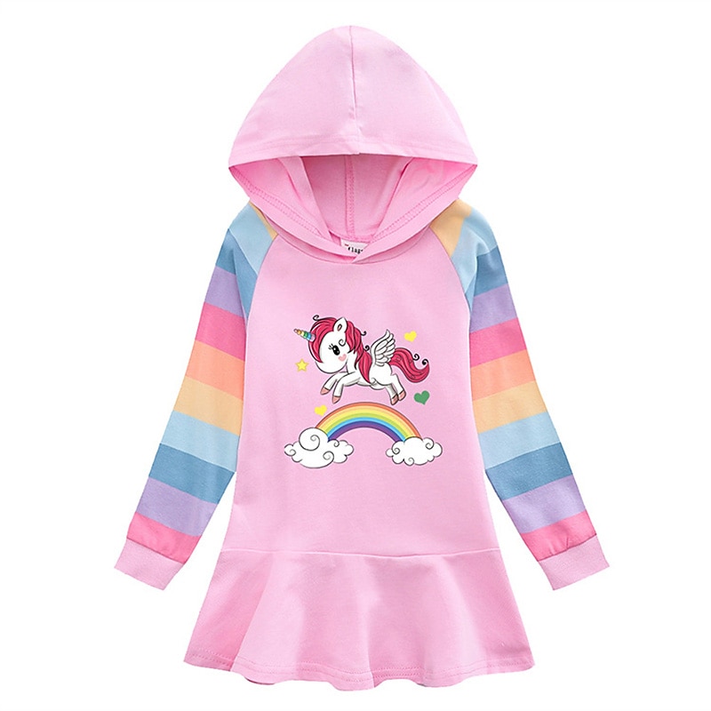 HOT ! Kids Girls' Dress Rainbow Unicorn Stripe Long Sleeve Outdoor Casual Ruffle Fashion Cute Daily Cotton Knee-length Hoodie Dress Casual Dress Spring Fall 2-8 Years Pink Purple Rose Red