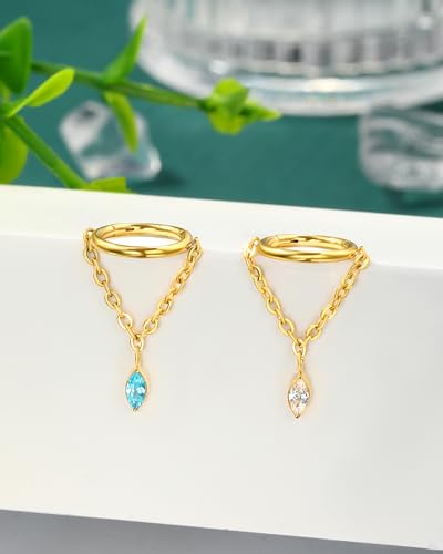 • [Cute Design] Detailed Sleek Dangle Chain Helix Earring Blue CZ Gold Dangling Rook Hoop Piercing Jewelry, Cute Dangly Surgical Steel Helix Ring.