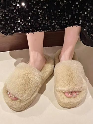 HOT ! Cross-band Fuzzy Slippers Thick Sole Fluffy Cozy Comfy Memory Foam Open Toe House Slippers for Women Soft Faux Fur Plush Slides Anti-Skid Indoor Outdoor Home Bedroom Shoes
