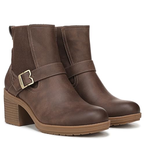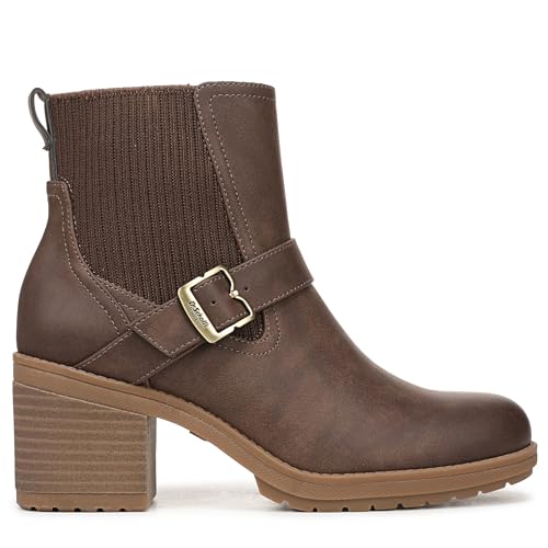 • FIT: Outside stretch gore and inside zip closure for easy on/off STYLE: Womens ankle boots with round toe, Chelsea-inspired stretch gore, strap with iconic buckle detail, back pull tab, and 2 3/4 inch stacked heel with TPR lug sole.