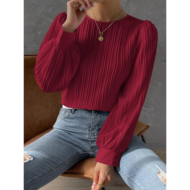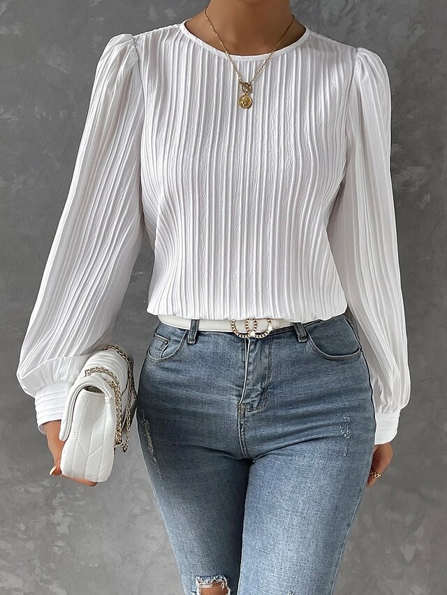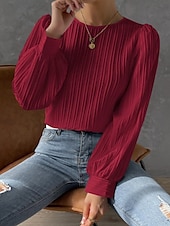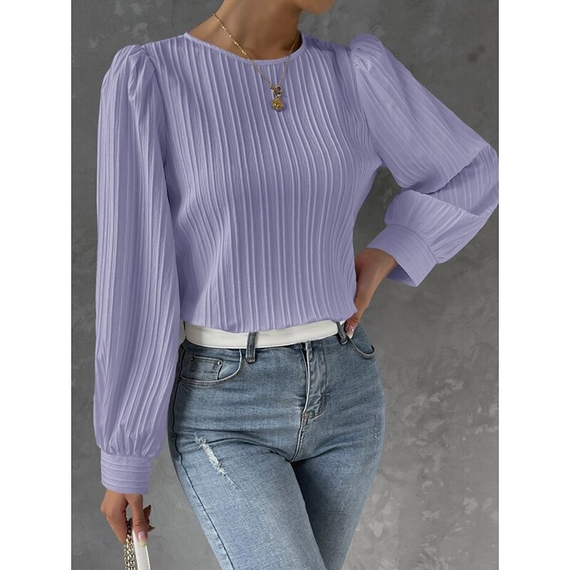 Highlights [Fabric]: Expertly crafted from high-quality polyester, this elegant tunic boasts a lightweight and breathable texture, perfect for the transitional seasons of spring and fall. The fabric's subtle ribbed pattern offers depth and a sophisticated touch to your outfit. [Fit]: Designed with a loose fit, this tunic drapes gracefully over the body, providing a comfortable yet chic look. Its tailored fit ensures a flattering silhouette suitable for a variety of body types. [Design Highlights]: This stylish blouse features classic lantern sleeves, gently pleated at the shoulders for a graceful, slightly puffed effect. The crew neckline gives it a timeless appeal, making it a versatile piece in any wardrobe. [Occasions]: Ideal for both casual and elegant outings, this tunic is perfect for daily wear, whether paired with jeans for a relaxed look or with skirts for a more polished appearance. Its solid color and plain pattern make it a versatile choice for numerous occasions. [Size]: Available in a range of sizes from S to XL, this tunic is designed to accommodate different body shapes, ensuring a comfortable and perfect fit for everyone.