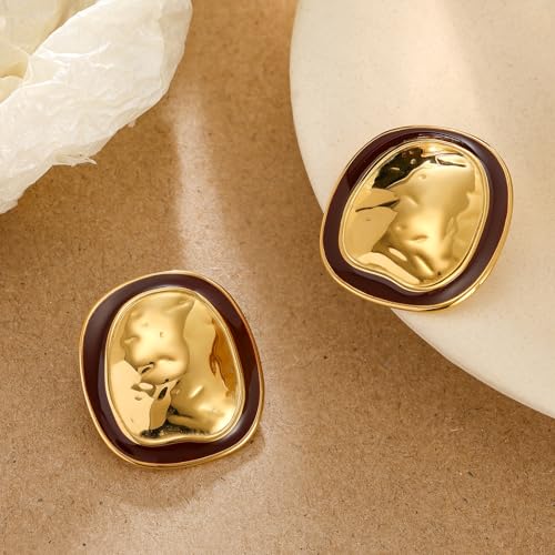 HOT ! Gold Chunky Earrings Vintage Burgundy Maroon Statement Earrings for Women 14K Gold Hammered Oval Stud Non Tarnish
