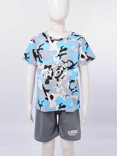 HOT ! easyforever Kids Boys Sports Outfit Set Short Sleeve Camouflage Print T-shirt With Shorts For Soccer Basketball Workout Light Blue 13-14 Years
