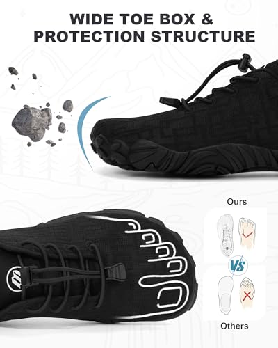 • 【Wide Toe Box】Hike barefoot shoes are designed with a wider toe box to give your toes plenty of room to spread out, allowing them to move naturally and comfortably. This design promotes a more active fit and helps your forefoot relax.