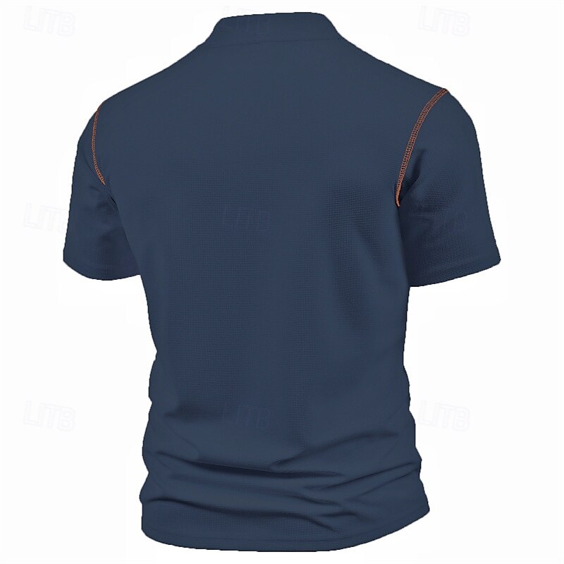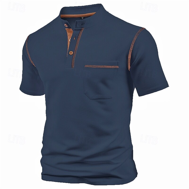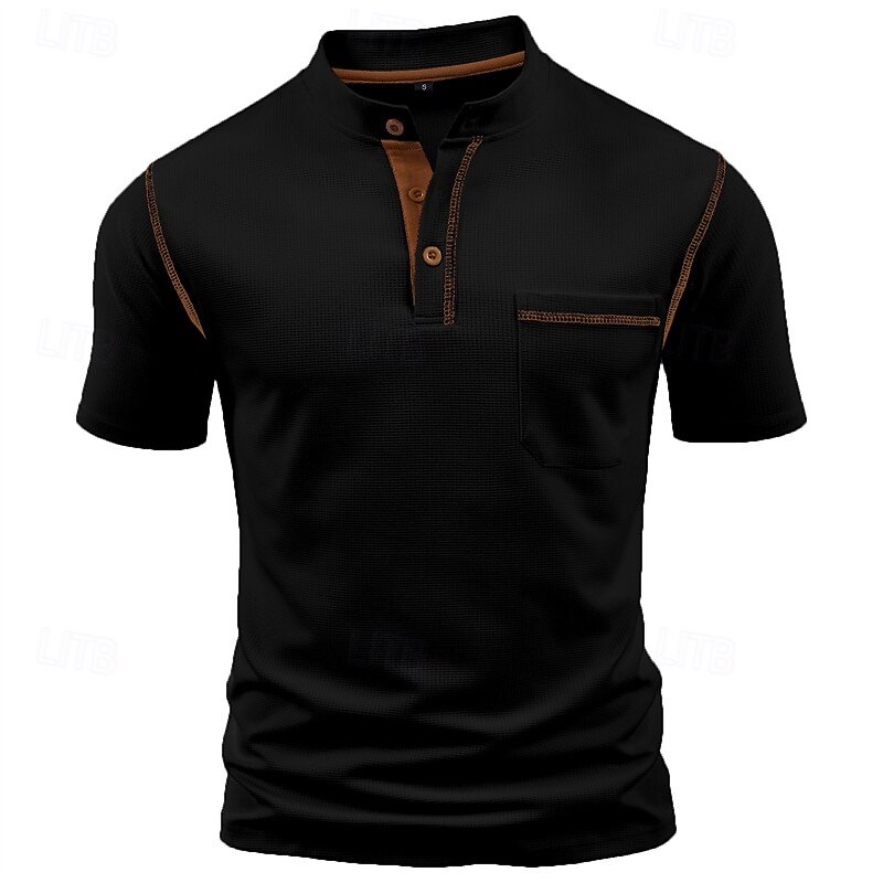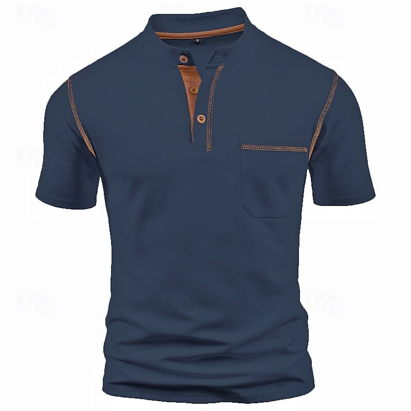 Highlights Experience ultimate comfort and style this summer with our men's short sleeve Henley shirt. Made from high-quality polyester fabric, this basic top features a trendy color block and patchwork design with a convenient pocket. Perfect for vacation or casual outings.
