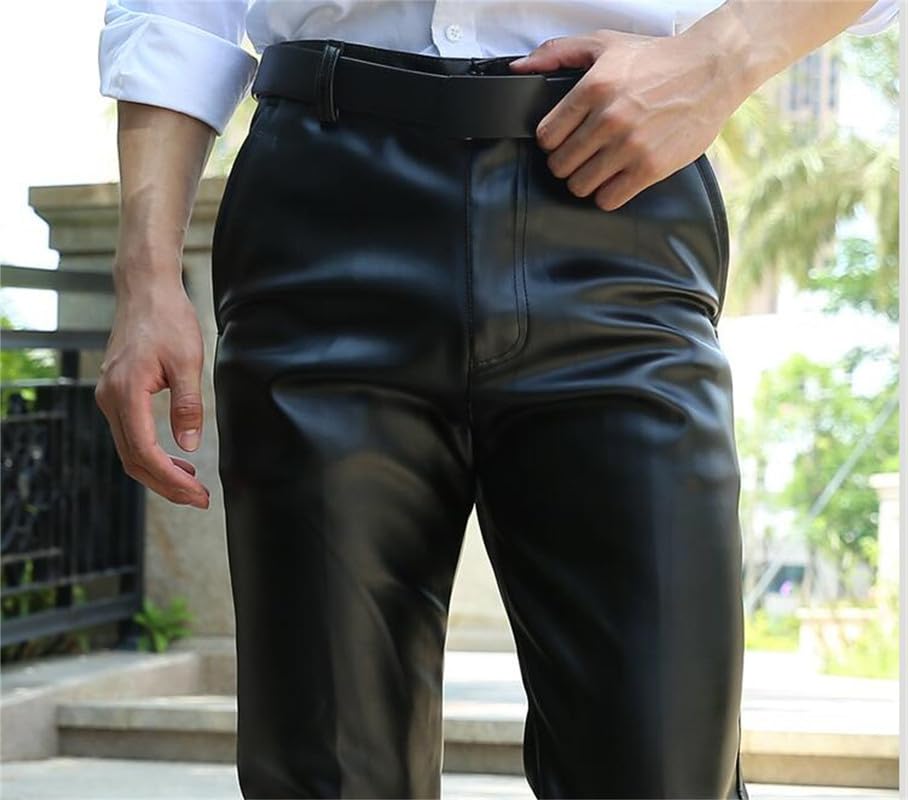 • 🌸🌷Men's Black Leather Motorcycle Pants Winter Faux Leather Pants Mens Plush PU Leather Trousers, Men Warm Straight Leg Leather Pants