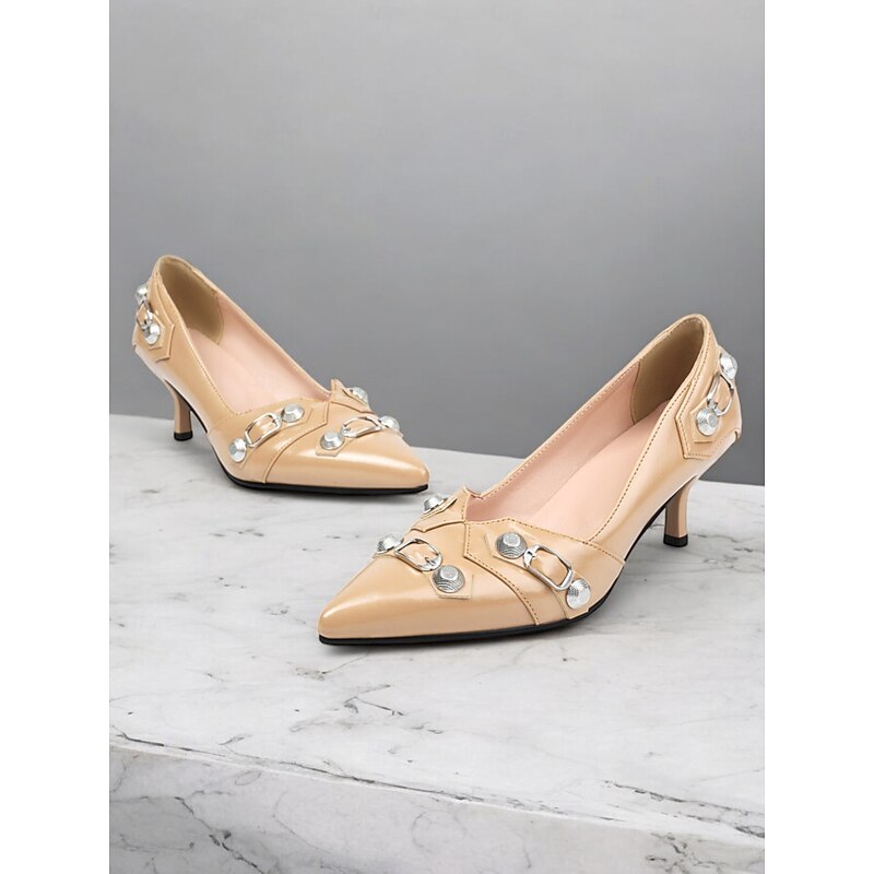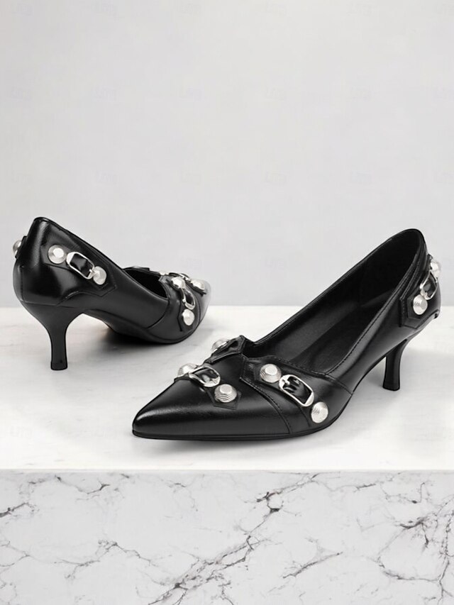 Highlights [Fabric and Material] : Designed with a sleek pointed toe, these women's pumps are crafted from premium glossy faux leather, offering a sophisticated and polished appearance. The shoes are embellished with rivet details, enhancing both durability and style. [Shape and Fit] : The mid-height stiletto heel provides the perfect balance between comfort and style, making these pumps ideal for extended wear during work or special occasions. They are also likely to feature a soft-lined interior for added comfort and a snug fit. [Design Highlights] : The shoes are adorned with metallic embellishments and decorative buckles, giving them a modern and edgy touch. Their loafer-style closure ensures ease of wear while maintaining a chic look. [Occasions] : Perfect for both work and party settings, these pumps are an excellent choice for those looking to add a stylish yet professional edge to their ensemble. Whether for a day at the office or an evening out, they seamlessly blend sophistication with contemporary flair. [Size Range] : Available in a range of sizes from US5.5 to US10.5, these pumps cater to a variety of foot sizes, ensuring a comfortable fit for many.