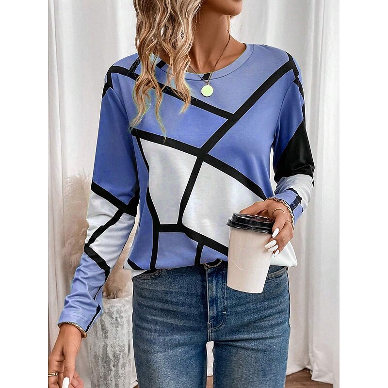 Women's T shirt Crew Neck Long Sleeve Tunic Casual Color Block Print Regular Tops Daily Pink Navy Blue Blue Purple Spring Fall 1