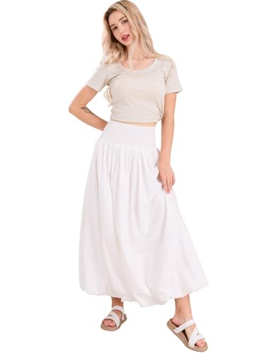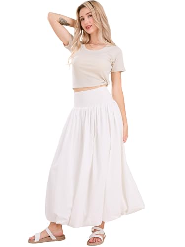 HOT ! ebossy Women's Smocked High Waist Pleated Solid Color A-Line Flowy Bud Lantern Long Skirt
