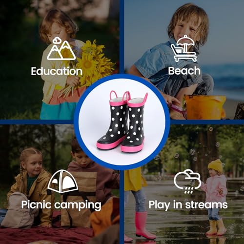 • EASY TO PUT ON AND TAKE OFF: The lightweight construction (about 1/4 the weight of regular boots) and durable handles make it easier for kids to learn to put on and take off the rain boots for toddler girl on their own. And the handles provide parents with grab-and-go convenience