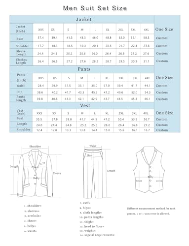 • Package includes: Jacket vest & pants, 3-piece suit double breasted blazer for men suits,there May be a slight color different between the photo and the finished suit. Hope you can understand this.We have a custom suits service.