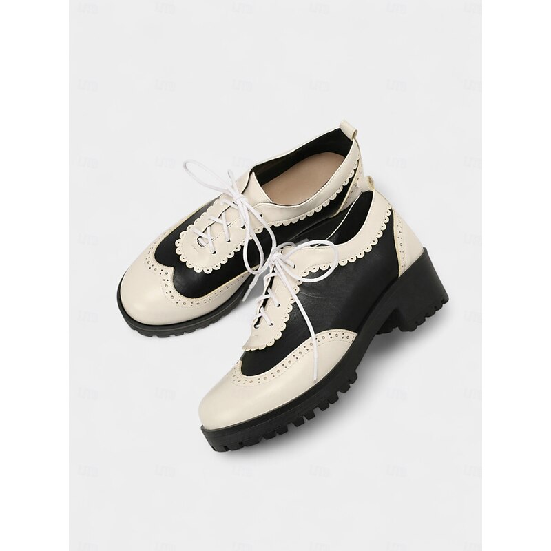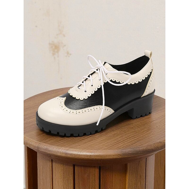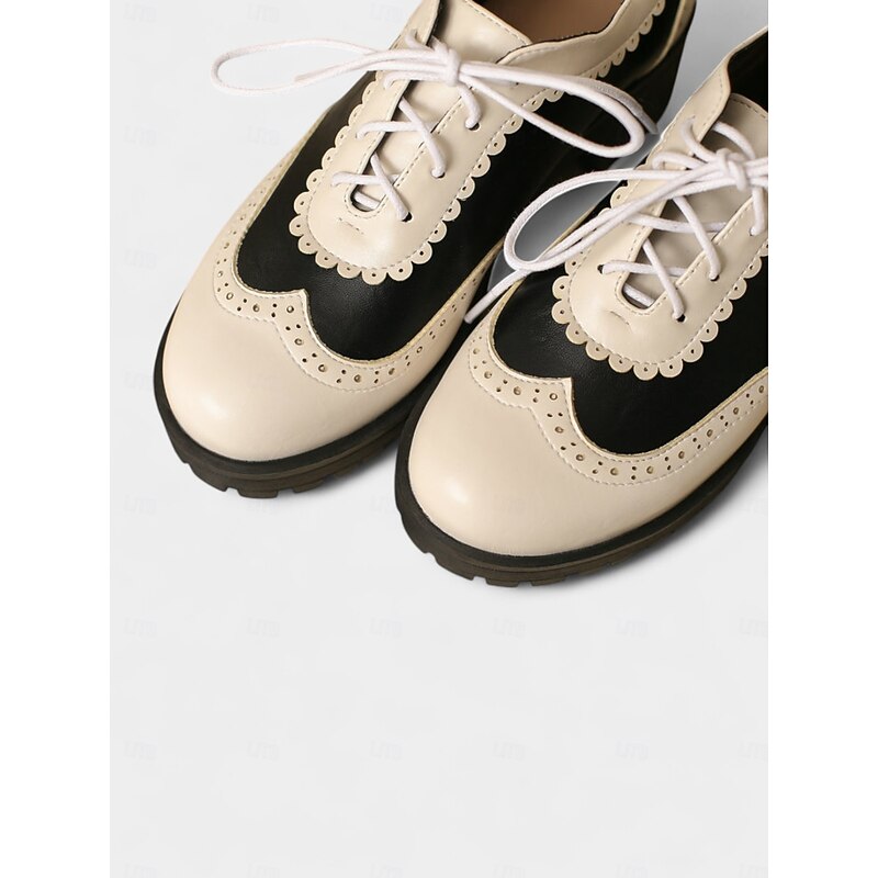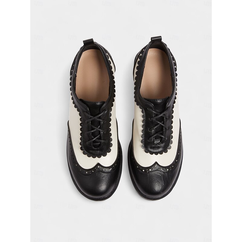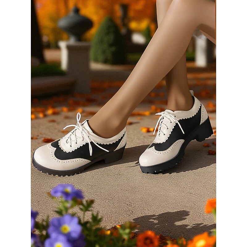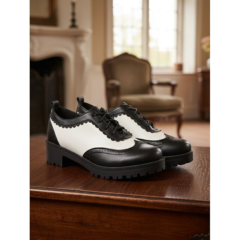 HOT ! Women's 1950s Vintage Black and White Oxford Brogue Shoes with Lace-Up Design and Low Block Heel - Retro Oktoberfest Footwear for Casual Wear, Work and Cosplay Outfits