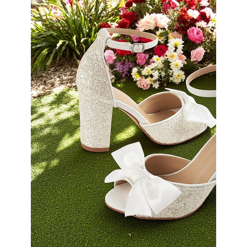 Women's White Glitter Block Heel Wedding Sandals with Ankle Strap and Satin Bow – Elegant Open Toe Bridal Shoes for Garden Ceremonies and Outdoor Events 5