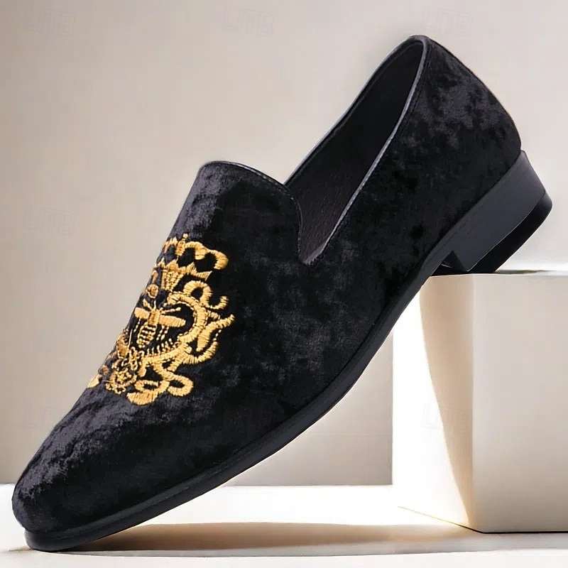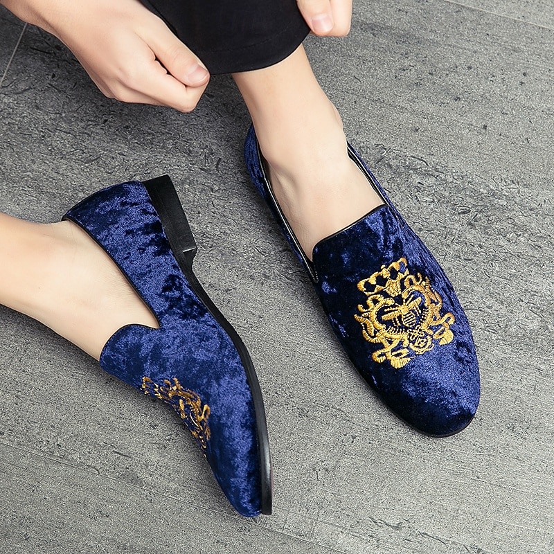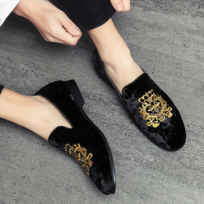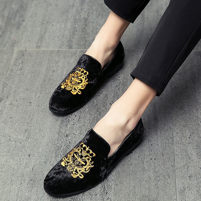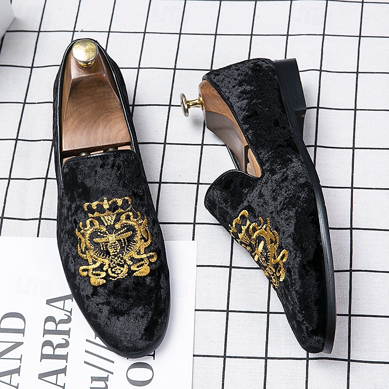Highlights [Fabric] : Crafted from luxurious velvet fabric, these men's loafers offer a plush, soft texture that blends comfort with high-end style. The rich burgundy hue adds to the opulent appearance, making these shoes a standout choice for any formal setting. [Fit] : These slip-on loafers feature a sleek, minimalist design with a round toe shape, providing both elegance and a comfortable fit. The high-quality construction ensures a secure feel with each step, thanks to the slip-resistant black rubber sole. [Design Highlights] : The loafers are adorned with intricate golden embroidery on the upper, infusing a sense of sophistication and elegance. This detailed design element elevates the overall look, while the PU lining adds to the luxurious feel and durability of the shoes. [Occasions] : Ideal for weddings, formal events, and stylish evenings out, these loafers are perfect for any occasion that demands a touch of classic elegance and contemporary flair. They effortlessly enhance your ensemble, making them a versatile addition to any wardrobe. [Size Range] : Available in a range of sizes from US6-6.5 to US10.5, these loafers cater to diverse preferences, ensuring the perfect fit for any gentleman looking to make a statement at special occasions.