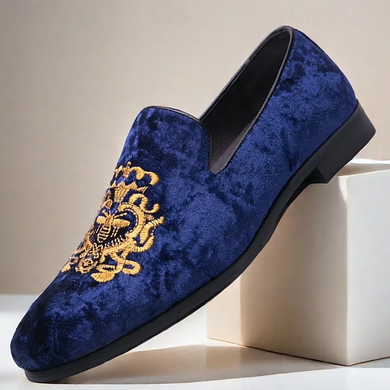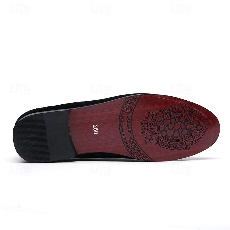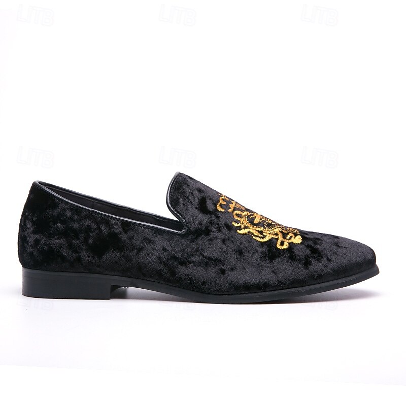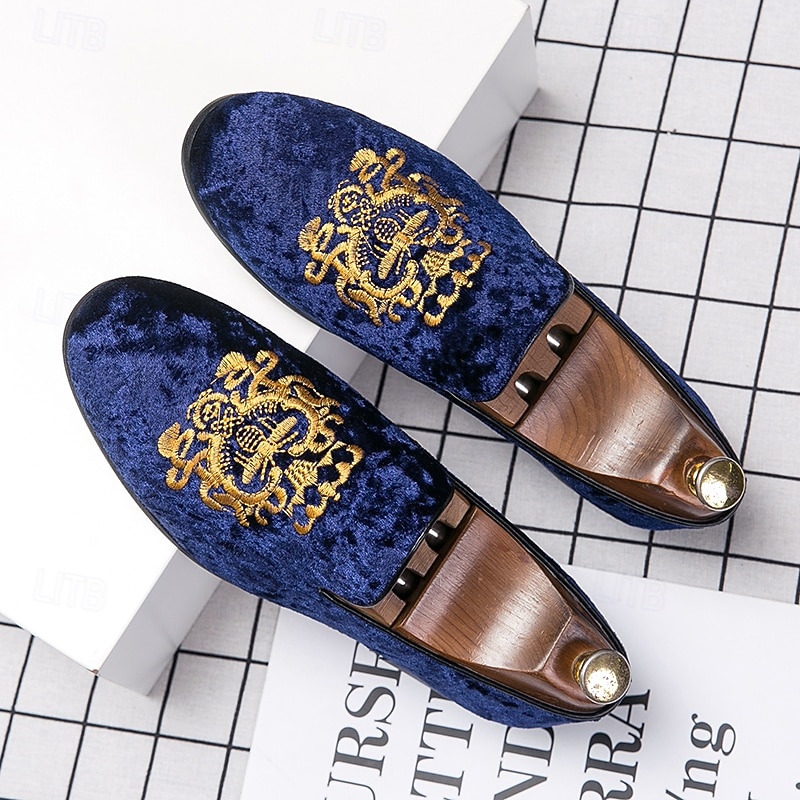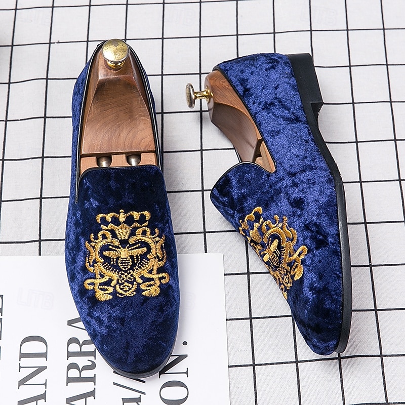 Highlights [Fabric] : Crafted from luxurious velvet fabric, these men's loafers offer a plush, soft texture that blends comfort with high-end style. The rich burgundy hue adds to the opulent appearance, making these shoes a standout choice for any formal setting. [Fit] : These slip-on loafers feature a sleek, minimalist design with a round toe shape, providing both elegance and a comfortable fit. The high-quality construction ensures a secure feel with each step, thanks to the slip-resistant black rubber sole. [Design Highlights] : The loafers are adorned with intricate golden embroidery on the upper, infusing a sense of sophistication and elegance. This detailed design element elevates the overall look, while the PU lining adds to the luxurious feel and durability of the shoes. [Occasions] : Ideal for weddings, formal events, and stylish evenings out, these loafers are perfect for any occasion that demands a touch of classic elegance and contemporary flair. They effortlessly enhance your ensemble, making them a versatile addition to any wardrobe. [Size Range] : Available in a range of sizes from US6-6.5 to US10.5, these loafers cater to diverse preferences, ensuring the perfect fit for any gentleman looking to make a statement at special occasions.
