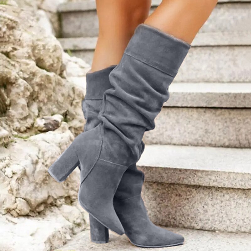 HOT ! Women's Gray Suede Slouchy Knee-High Boots with Pointed Toe and Block Heels - Elegant Fall and Winter Footwear for Casual and Dressy Occasions