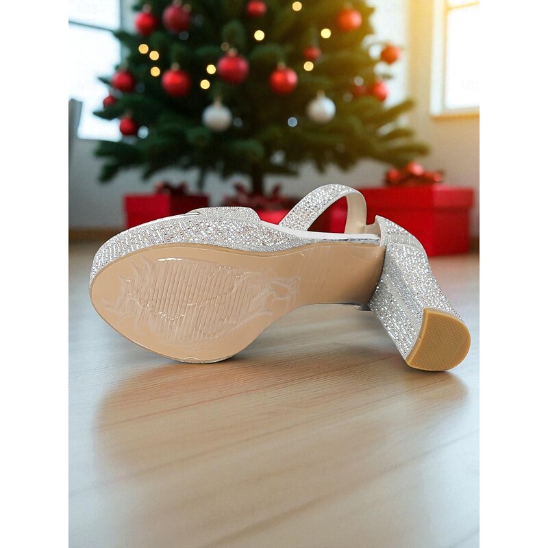 Women's Silver Platform High Heel Sandals - Glitter Ankle Strap Open Toe Party Shoes with Rhinestone Detailing, Glamorous Footwear for Nightlife, Christmas Parties and Holiday Events 4