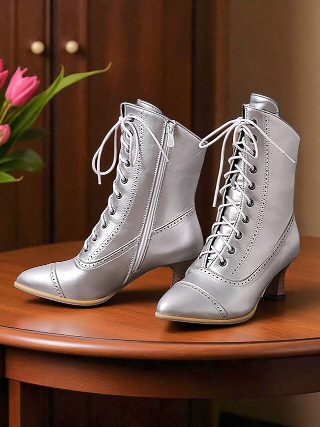 Women's Silver Victorian Edwardian Lace-Up Ankle Boots with Kitten Heel and Brogue Detailing - 1920s Retro Steampunk Style Dress Boots for Ladies, Perfect for Parties, Cosplay & Historical Outfit 25