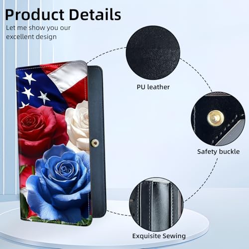 Womens Wallet,RFID Blocking Credit Card Slim Thin Holder,Long Bifold PU Leather Card Organizer,Cash Clutch Billfold Pocket Ladies Minimalist Travel Wallets,American Flag Roses 3