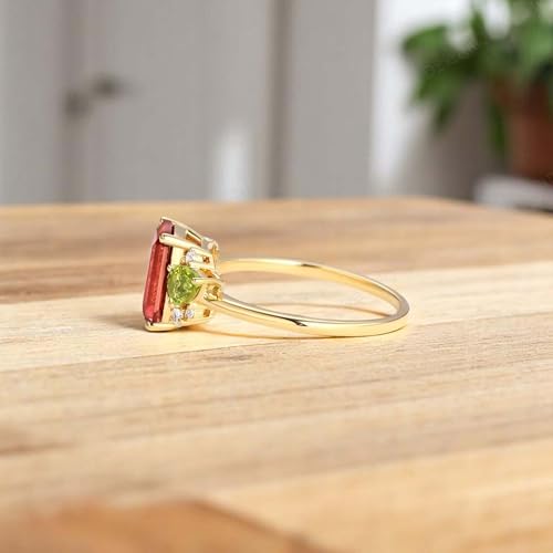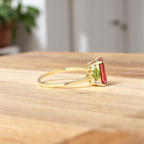 • Elegant Design: Features a stunning 8x6MM emerald-shaped pink tourmaline as the center stone, surrounded by sparkling peridot and diamond accents.