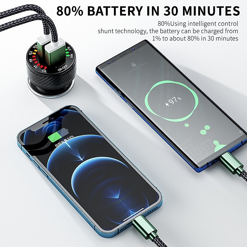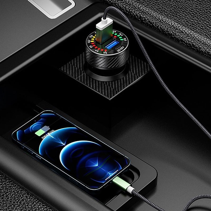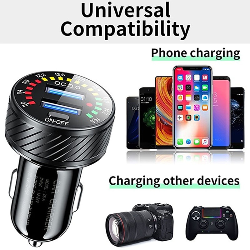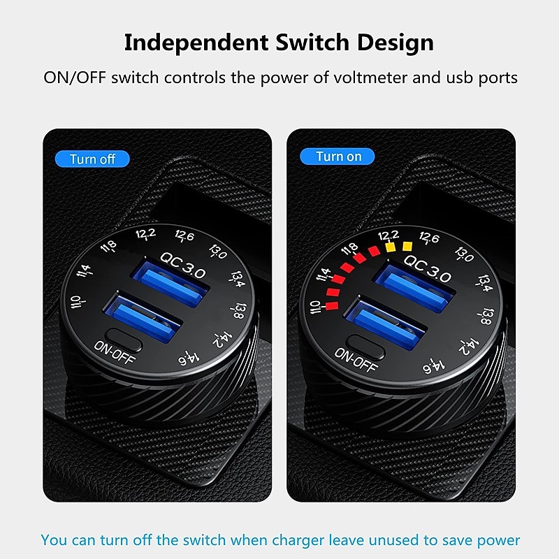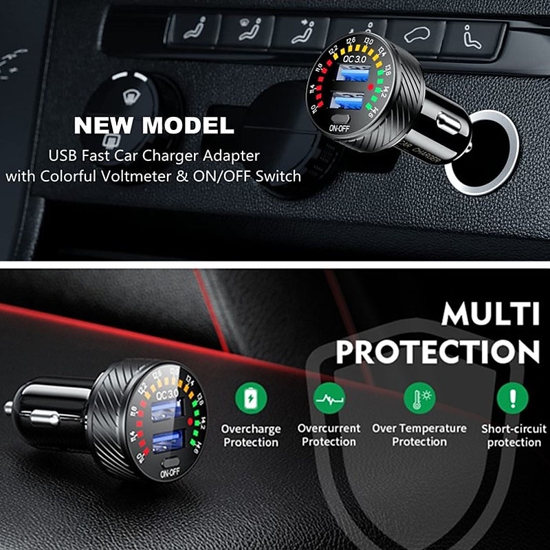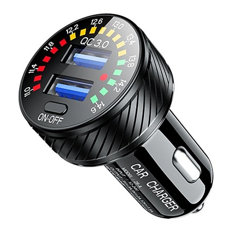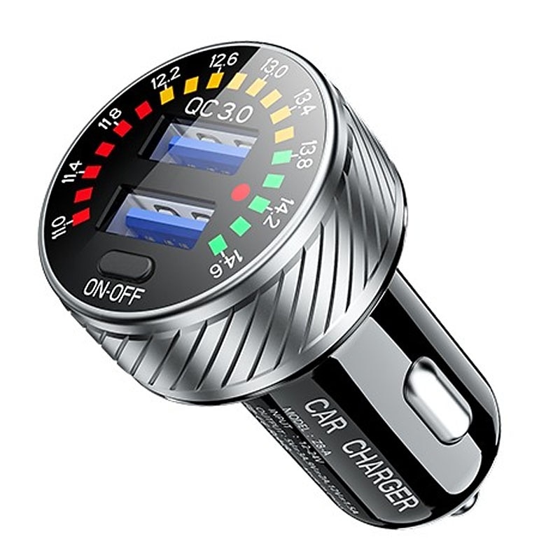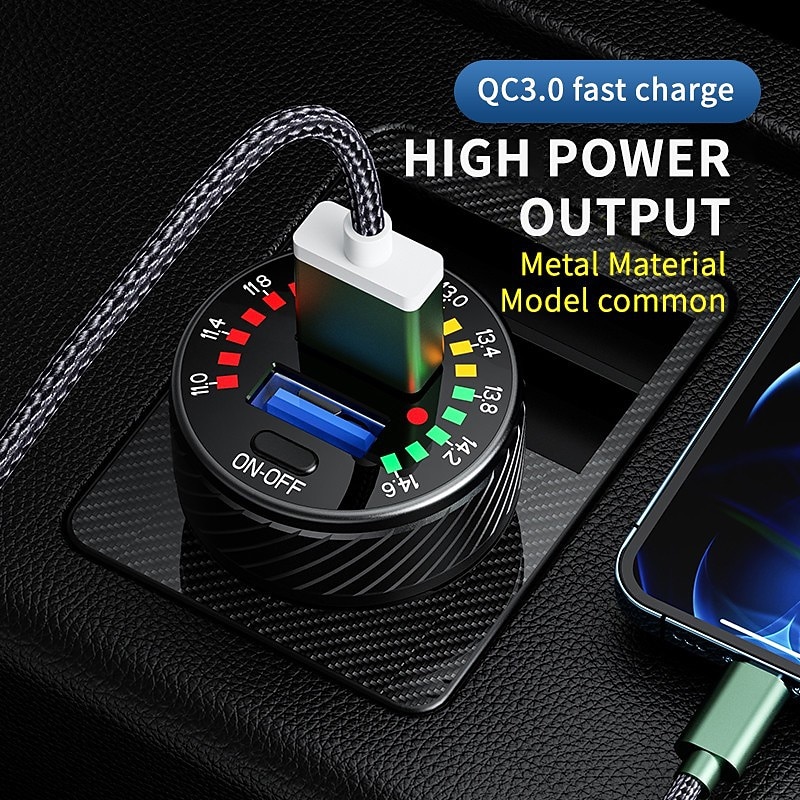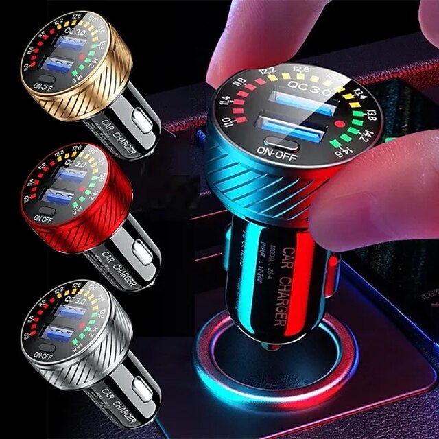 Highlights Description Show Less Feature: 1、With dual QC3.0 USB ports supporting, the car charger fast charge two compatible devices simultaneously at QC3.0 speed, up to 4X faster than conventional charging. Dual port total output 36W, each port output 18W / 3A. This car usb charger backward-compatible with QC 2.0 &1.0. 2、This car cigarette lighter charger equipped with colorful voltmeter which can monitor the voltage value of the car battery in real time, allowing you to know the battery level of the car at any time. Colored led lights can also help you easily find the car charger usb charging port in a dark environment. 3、The car charger is made of high temperature and low temperature resistant materials, which can be used in -20-60(℃)working environment. Built-in smart chip, escort your charging safety. 4、 Independent switch, free switch display mode, power on/off. 5、Universal dual USB fast car charger compatible with any mobile devices. Deliver the fastest possible charge to all non-Quick charge devices. Easy to plug & unplug, perfectly compatible with car cigarette lighter socket. Specifications: Item Name: Car Charger Material: Aluminum alloy + fireproof PC Color: Black/red/silver/gold Input Voltage: DC 12-24V Output Ports: Dual for QC3.0 USB 1 Output: DC 5V/3A; 9V/2A; 12V/1.5A USB 2 Output: DC 5V/3A; 9V/2A; 12V/1.5A Working Temperature: -20-60℃ Applicable Models: car Output Interface: USB Applicable Charging range: mobile phone, tablet, navigator, mp3, electronic dog and other USB-devices Package Included: 1*Car Charger