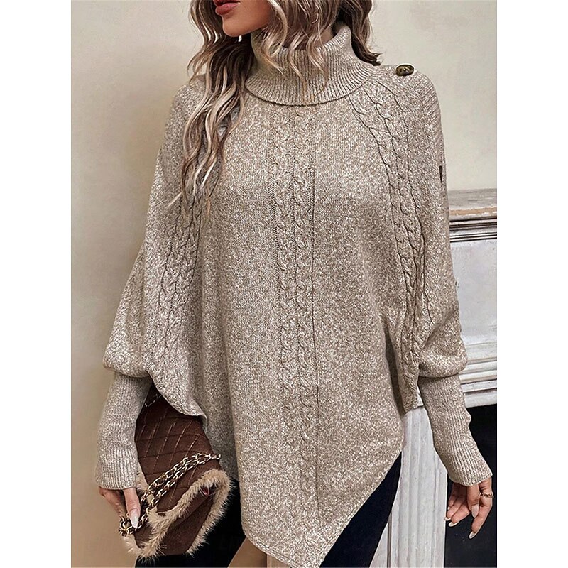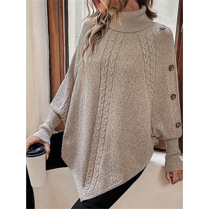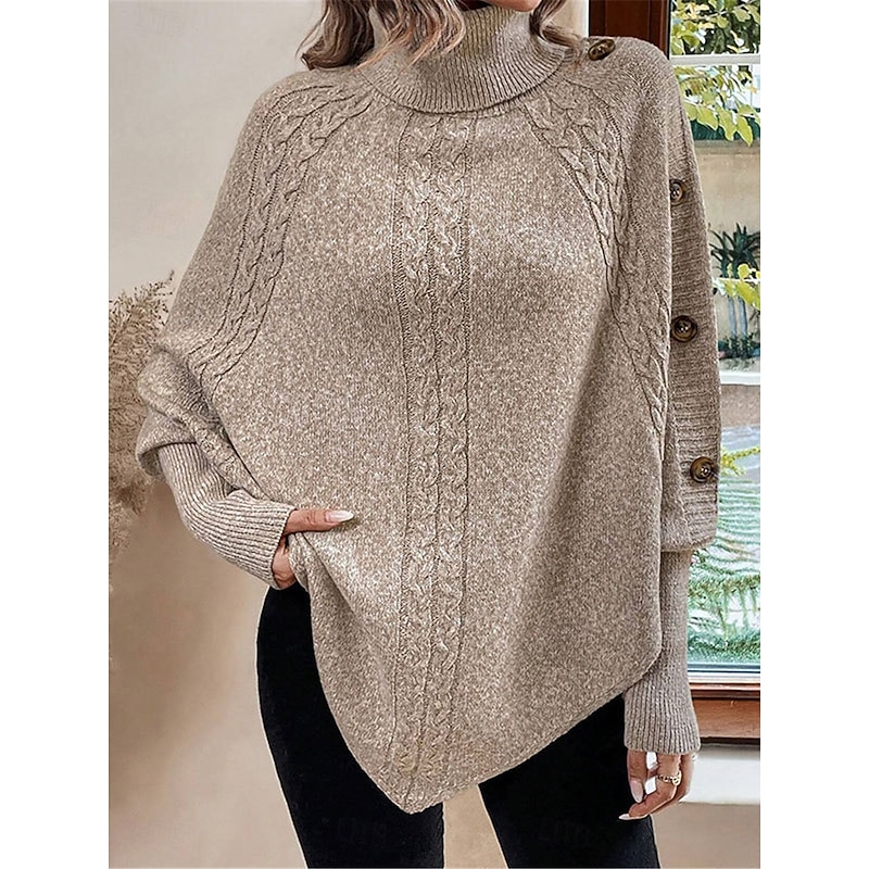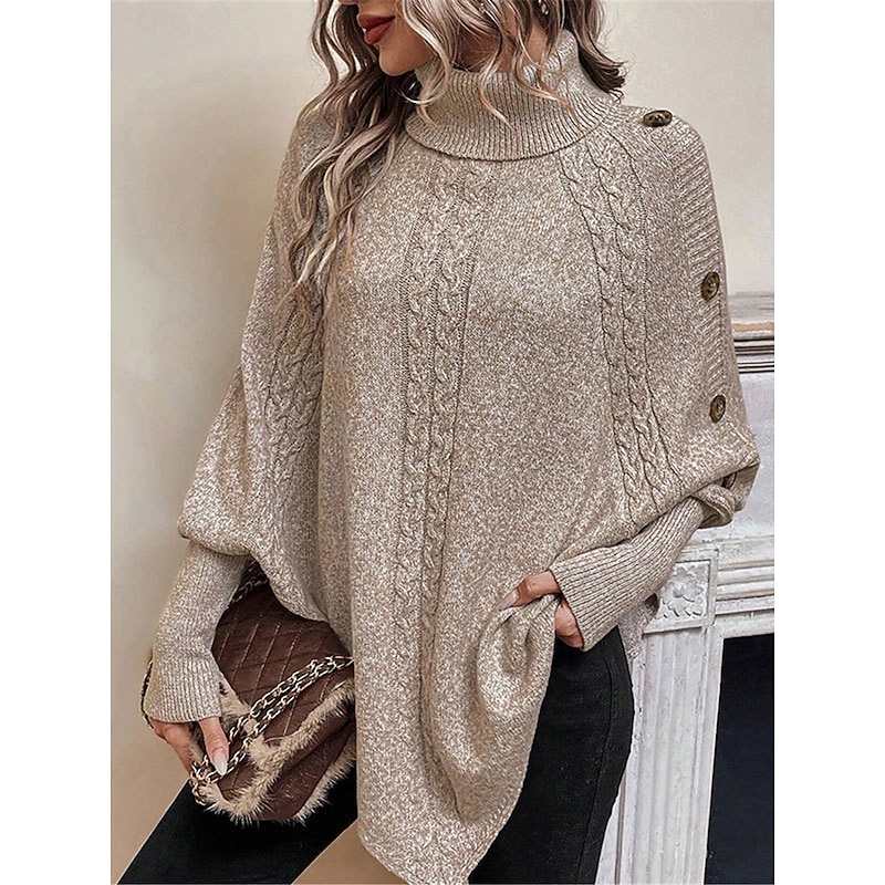 Highlights [Fabric] Crafted from a luxurious polyester blend, this sweater offers durability and a soft touch, ensuring comfort and warmth in fall and winter. The ribbed knit texture enhances the fabric’s elasticity, providing a cozy fit that adapts to various body shapes. [Silhouette] Featuring a loose fit with a poncho-style silhouette, this sweater provides a relaxed vibe while ensuring freedom of movement. Its regular top length makes it versatile for layering over other garments. [Design Highlights] The sweater showcases a chic turtleneck that not only adds elegance but also provides extra warmth during cooler days. Decorative buttons on one side enhance its sophisticated appearance, and the batwing sleeves drape gracefully, accentuating the flowing, stylish look. [Occasions] Perfect for daily wear, outdoor activities, or casual weekend outings, this sweater is ideal for those seeking style and comfort. Its neutral khaki color ensures it pairs seamlessly with a range of outfits, making it a staple piece for any autumn or winter wardrobe. [Size Range] Available in sizes S, M, L, and XL, offering a wide range of options to find the perfect fit.